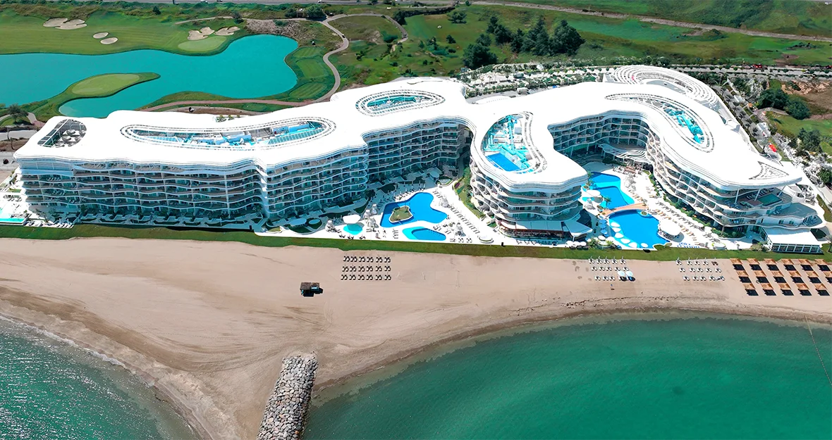 Strand getrennt. Ein 35 Hektar grosser Garten umgibt die Anlage.
