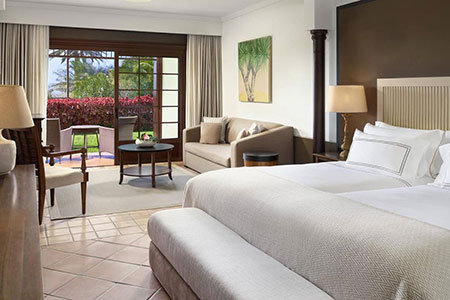 Chambres : 117 chambres dans 8 catégories différentes, équipées de terrasse, climatisation, WLAN, TV, téléphone, minibar, coffre-fort, salle de bains avec douche et baignoire, sèche-cheveux. Chambres Premier avec (40 m2), Junior Suite Standard, vue sur le terrain de golf ou sur la mer (40 m2) ainsi que différentes suites (40–50 m2)sont disponibles.