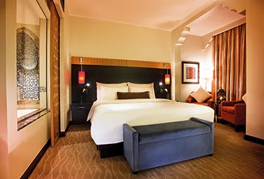 Zimmer: Die 396 Zimmer im marokkanischen Stil sind mit WLAN (kostenlos), TV, Minibar, Zimmerservice sowie Tee- und Kaffeekocher ausgestattet. Die Club-Zimmer bieten ausserdem eine Nespressomaschine und einen kostenlosen Flughafentransfer. Die Suiten verfügen zusätzlich über ein Wohnzimmer. Einige Zimmer haben eine Terrasse.